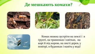 Кома́хи (Insecta) — клас членистоногих тварин з підтипу трахейнодихаючих. Найчисельніший і найрізноманітніший клас в усьому тваринному царстві: станом на серпень 2013 року було відомо 1 070 781 вид комах, включно з 17 203 викопними видами ; однак науковці припускають, що …