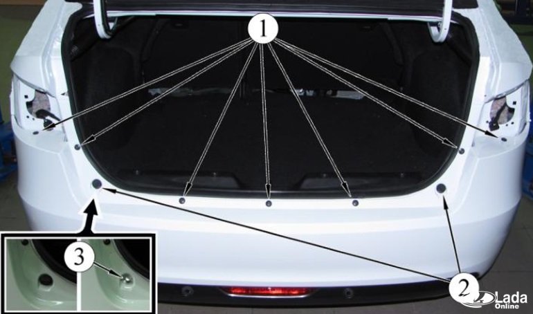 Якщо захисна деталь пошкоджена, важливо вчасно провести демонтаж. Що робити: 1. З боку багажника демонтувати задні ліхтарі. Ключем на 8 мм відкрутити по три болти. 2. Нижнім кріпленням елемент захисту приєднано до кузова. Необхідно відвернути два болта.